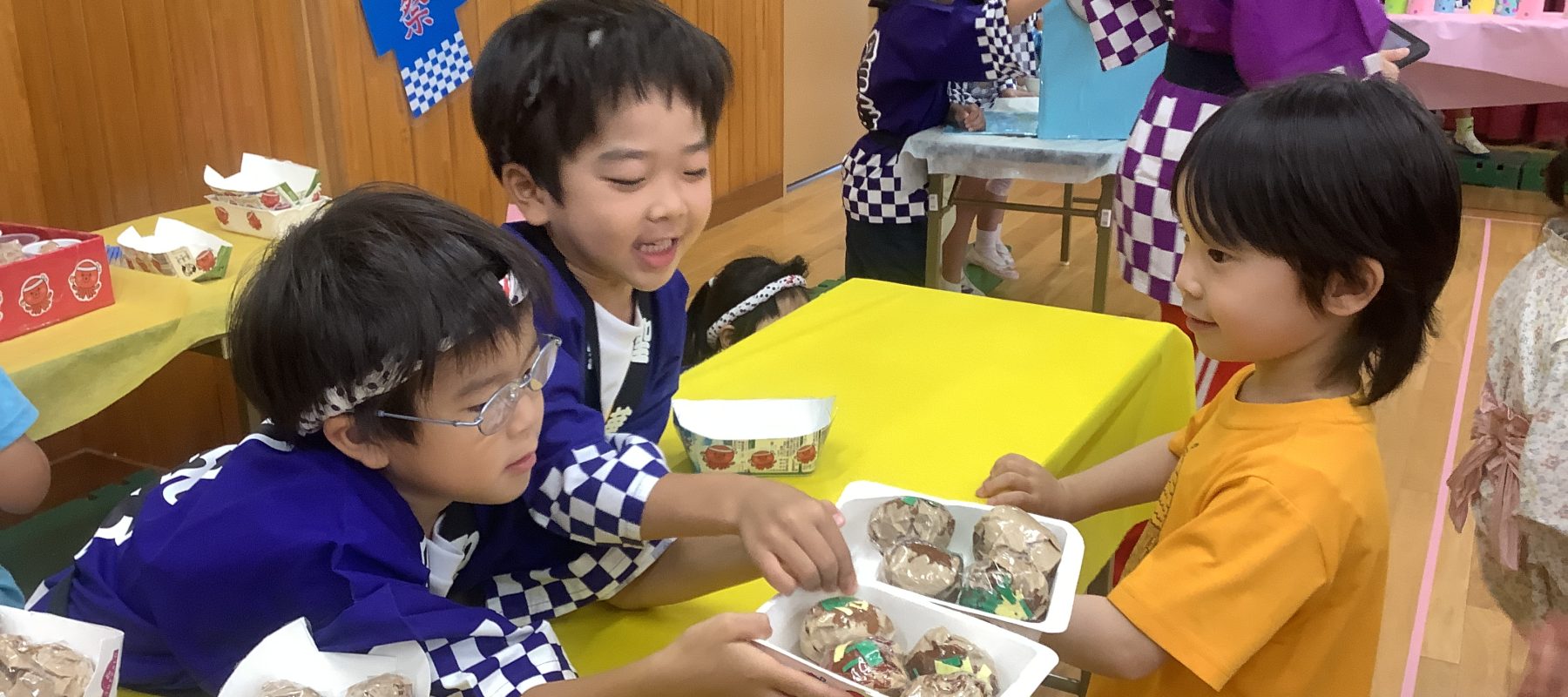 ひまわり組の子どもたちが企画、作成した縁日ごっこが始まりました!法被を着て「いらっしゃいませ!」とお店屋さんになりきる子どもたちの笑顔はとても眩しく、ホール中が活気あふれる楽しい空間に変身♪他のクラスの子どもたちに「どれにする?」と優しく声を掛けてあげたり手を繋いでやりとりをする姿も見られとても微笑ましかったです。夏ならではの行事に園内も大盛り上がりの毎日です。