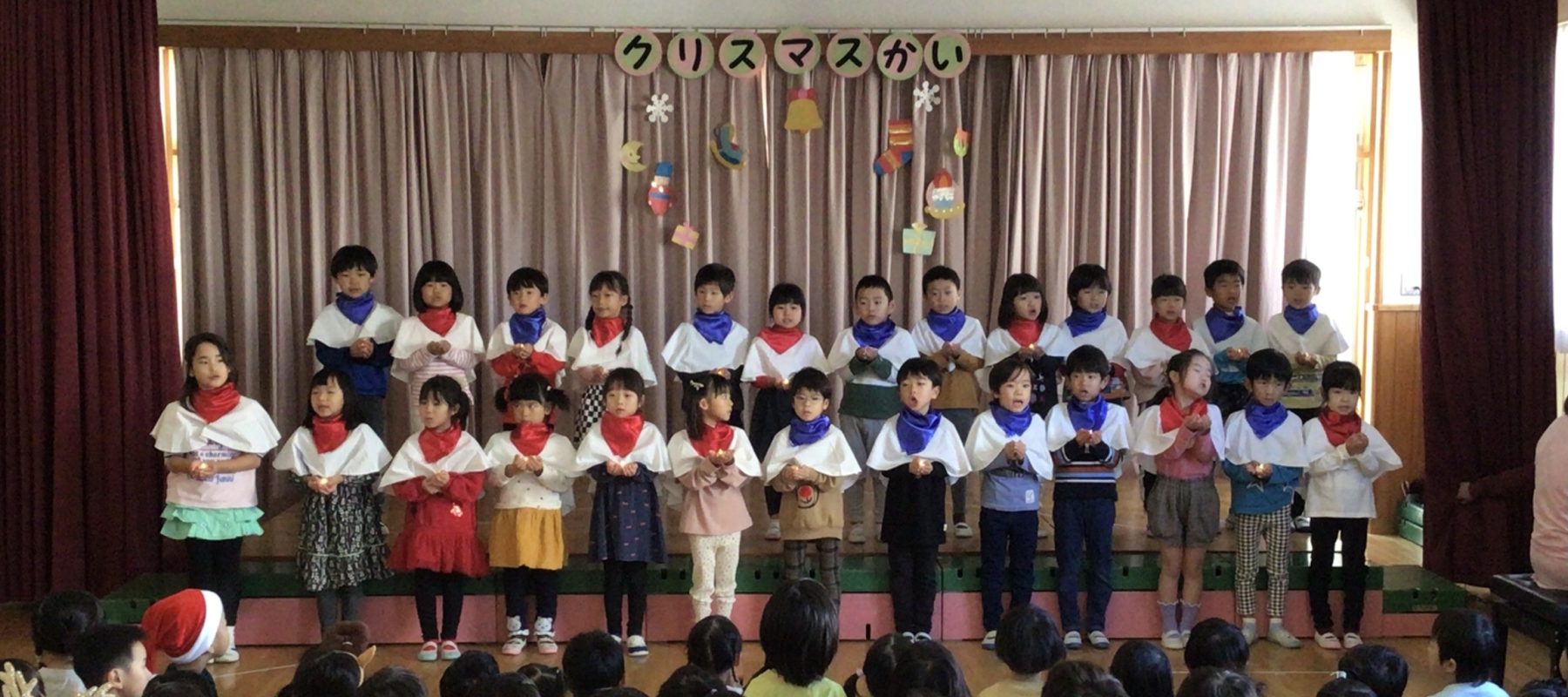 今日はクリスマス会がありました。ひまわり組のキャンドルサービスから始まり、キャンドルの光を見ながら聴く素敵な歌声に釘付けの子どもたち。その後は保育者による「三匹のこぶたのクリスマス」の劇とダンスを楽しみました。会の後は「サンタさん来ないかなあ」と眠りについた子どもたちの元にこっそりとプレゼントが置かれており、起きてびっくり。貰ったプレゼント箱を開け早速嬉しそうに遊んでいました。