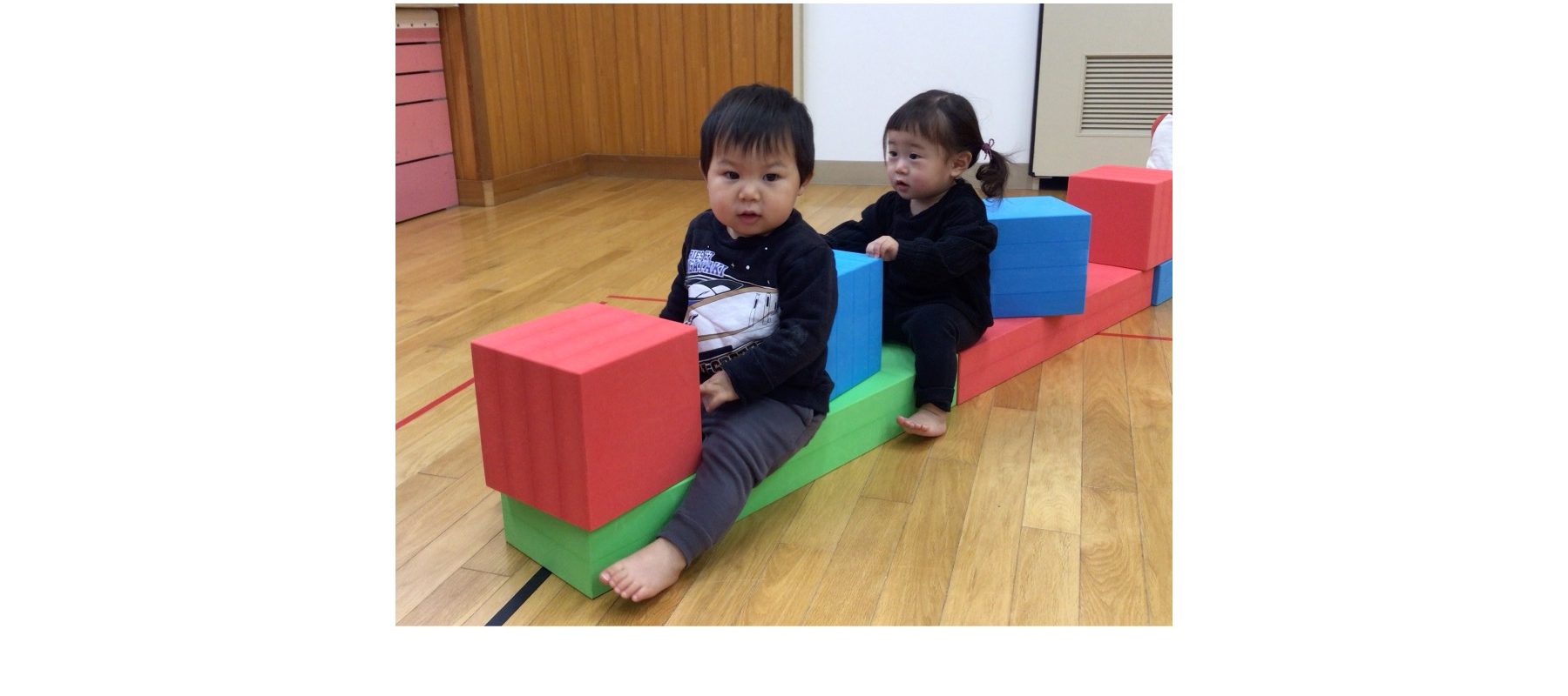 ソフト積み木で遊ぶのが大好きな0歳児クラスの子どもたち。長く繋げて乗れるようにすると、バスごっこのようにして楽しんでいました。一人が乗ると続々とお友だちが集まってきて、「ばいばい!」と手を振ったり、歌に合わせてノリノリな姿が可愛らしいです。