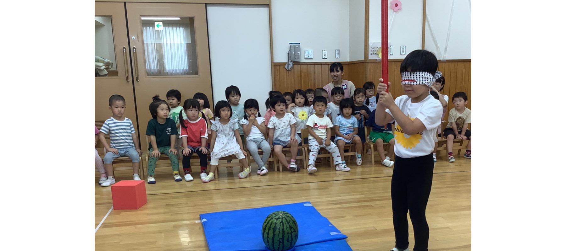 メインのすいか割りでは、すいかに向かってまっすぐに歩いていき、力強く棒を振り下ろしていた子どもたち。「みぎだよ!まえまえ!」などと大きな声で応援したりと雰囲気を楽しむ様子も見られました。すいかが割れると「割れた-!」と大はしゃぎで匂いを嗅いだり、食べることを楽しみにしているキラキラな笑顔で溢れていました。
