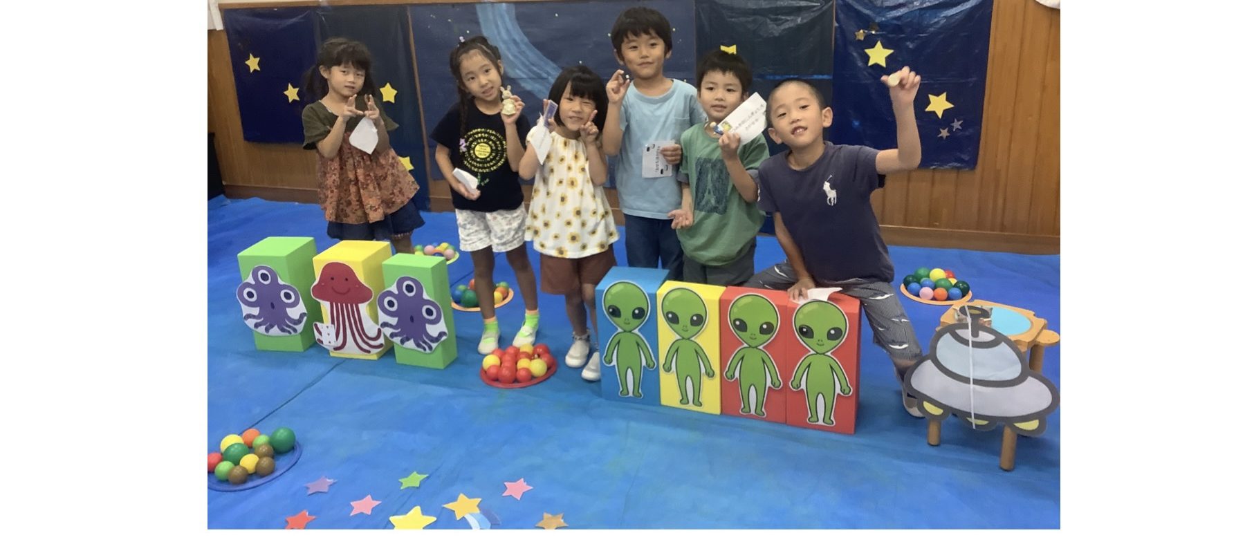 5歳児ひまわり組は、お楽しみ会がありました。クッキングで夕食を作り、完成するまでの間は、間違い探しをして大盛り上がり。夕食は、事前に自分で決めたメニュー表を栄養士さんに渡して、バイキングを楽しみました。自分たちで作ったことで喜んでおかわりもしていました。夕食後は、ミッケワールドへの招待状を発見!ミッションの紙をもらってワクワクしながらホールへ向かいました。ドアを開けると宇宙や海賊をテーマにしたミッケの世界が広がっており、「わぁー!すごい!」と全体を見渡しながら、自分のマークがついている玩具を見つけていました。終わった後も「楽しかった!」「もっとやりたかった!」と余韻に浸っていたひまわり組さんでした。