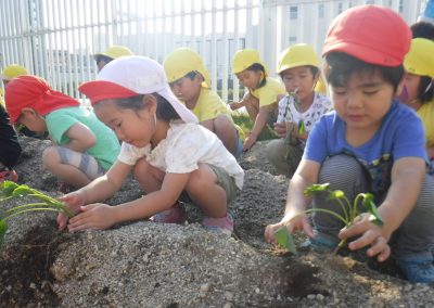幼児クラスで屋上の畑にさつま芋の苗を植えました。穴を掘って、その中に一本ずつ植えて優しく土をかけてあげる子どもたち。