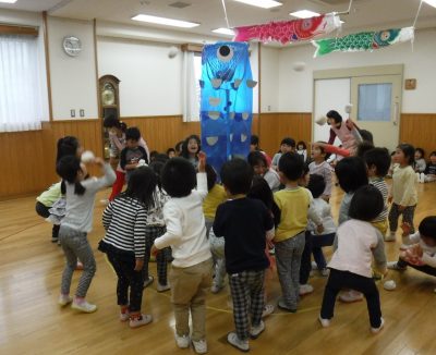 今年度のこいのぼり会は雨だった為、ホールで行いました。こいのぼりのクイズでは吹き流しや柏餅についてまた1つ詳しくなり、「知らなかった」「そうなんだ」等の声が聞こえてきました。また、各クラスのこいのぼりの製作では、乳児クラスは可愛らしく、幼児クラスはとっても上手なこいのぼりを紹介してくれました。その後は幼児クラスで赤チーム、青チームに分かれて玉入れゲームを行い、こいのぼりの口にボールを入れようとする一生懸命な子どもたちの可愛い姿が見られました。