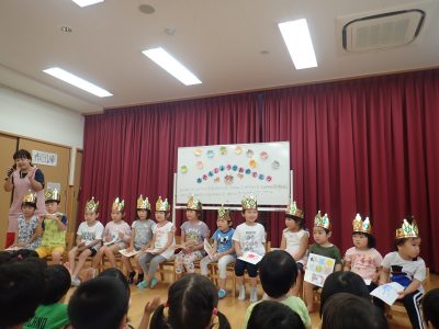 6月の誕生日会がありました。2歳から5歳の子どもたちがホールに集まり、誕生児をお祝いしました。大勢の友だちの前に出ると、少しドキドキしたり、恥ずかしがる子もいましたが、皆で「たんじょうび」の歌をうたったり、プレゼントをもらうと嬉しそうな表情を浮かべる子どもたちでした。今回の保育者の出し物は「ビニール傘シアター」でした。保育者と一緒に掛け声を言ったり、「すごーい」という声が聞こえたりと、盛り上がる姿が見られ楽しい会になりました。