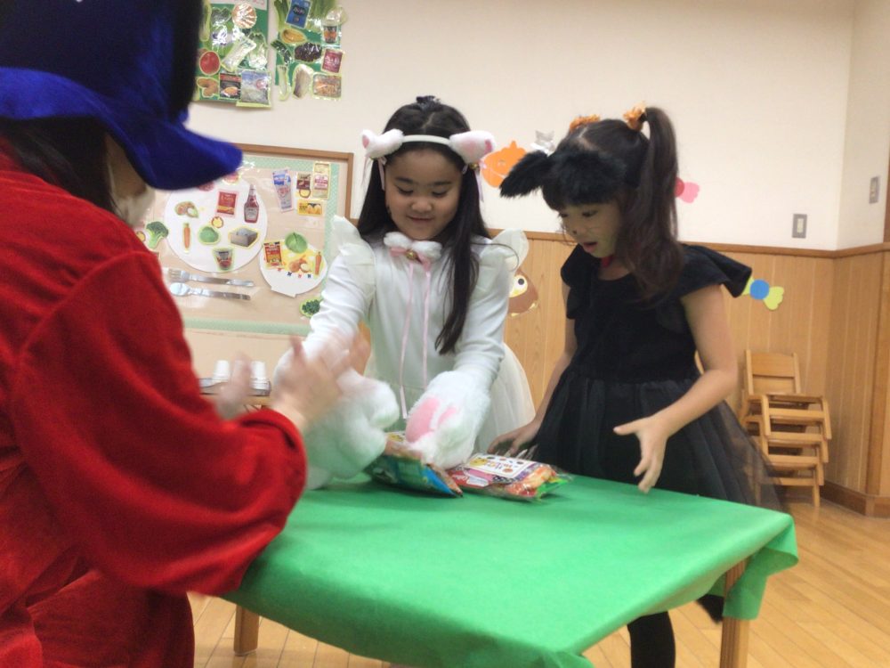 10月27日にハロウィンを行いました。子どもたちは朝から思い思いの仮装をし、楽しみに登園しました。幼児は目をキラキラさせて“Trick or Treat”と言い英語講師からお菓子をもらいました。各クラスでは担任の先生とゲームやファッションショーをし、二階のホールでは、ボーリングや的当て、フォトスポット等、沢山の遊びを楽しみました。また、今回はハロウィンとドラえもんがテーマだったので大人も懐かしく楽しんでいたり、給食も可愛く、おいしいと子どもたちから評判でした。楽しい一日を過ごしました。