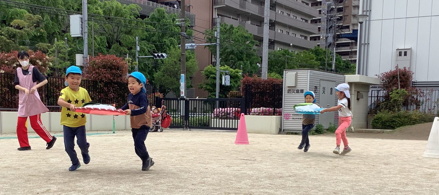 こいのぼり会を行いました。飾ってあるこいのぼりや柏餅、兜の由来を聞き、保育士が背負ったリュックから大きな柏餅が出てくるとみんなもびっくり!4、5歳は柏餅リレーを紅白に別れ楽しみました。「がんばれー!」と元気に応援し盛り上がり、中には悔しくて泣いてしまう子も。園長先生の「もう一回やろう!」という一声に「やったー!」と再び笑顔で走り楽しみました。