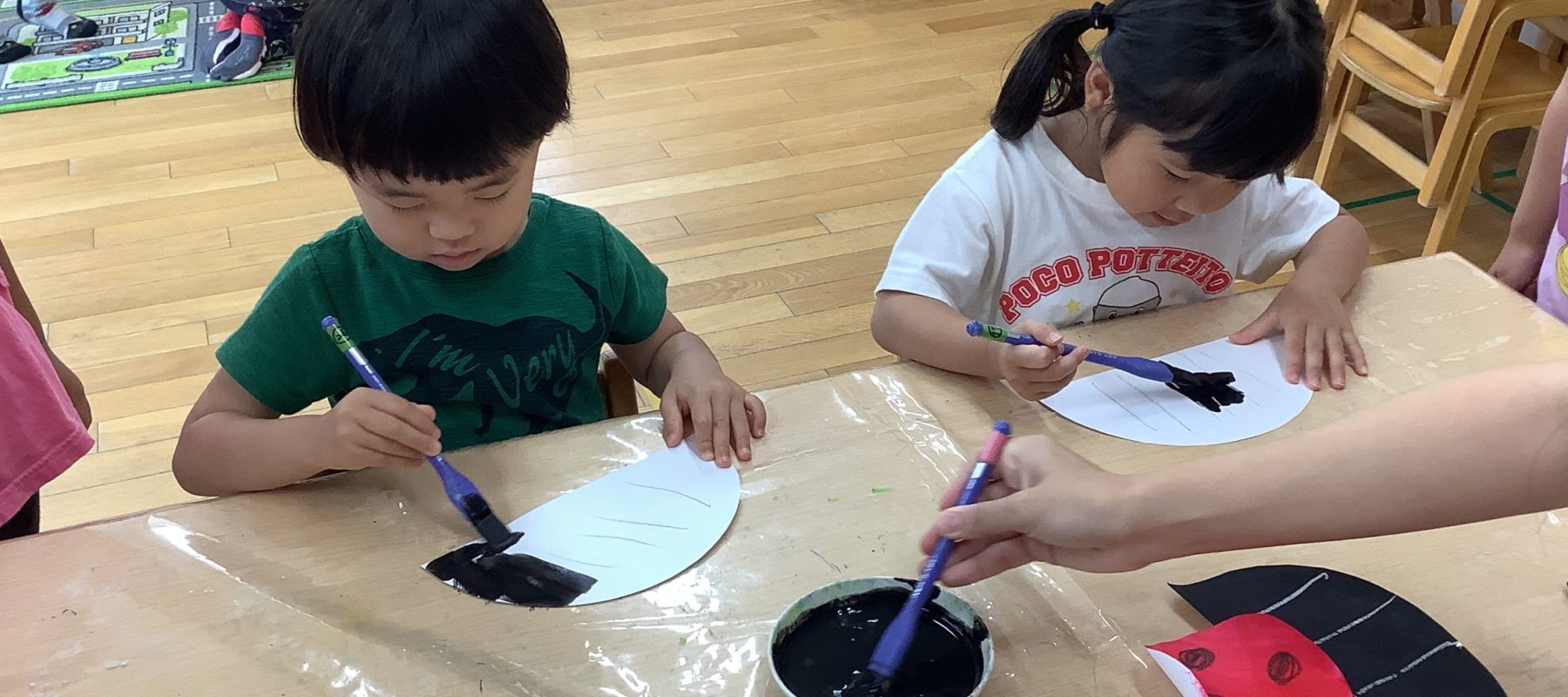 初めて筆を使ったので、筆に興味を持ちながら楽しそうに塗っていた子どもたちでした。