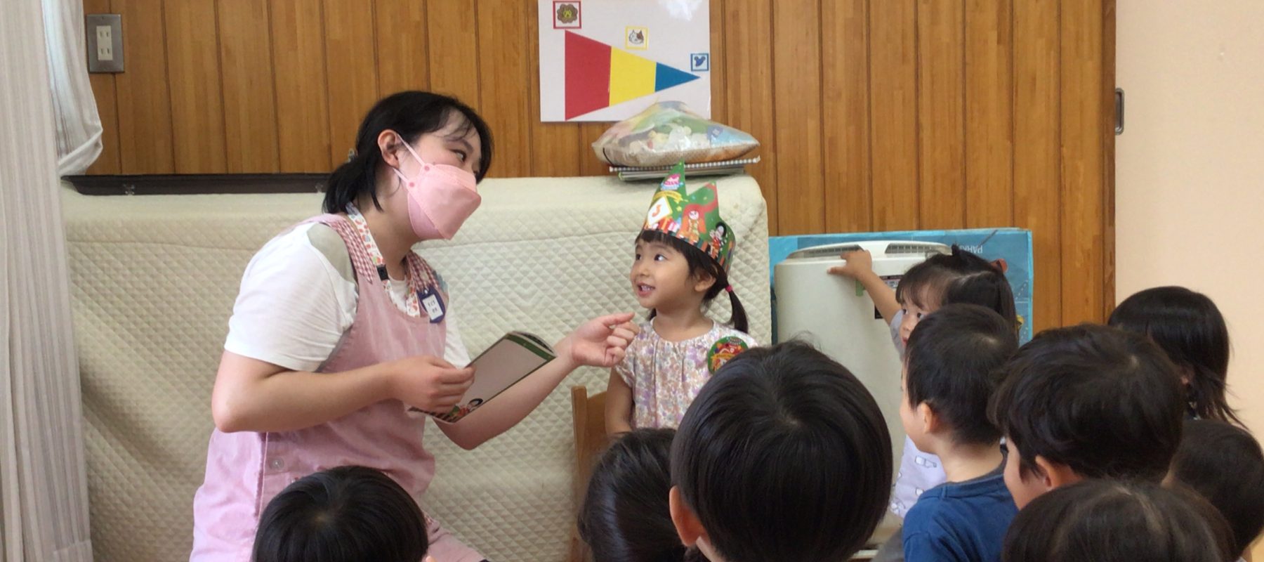 毎月第三木曜日はみんなが心待ちにしているハッピーデーです。誕生日の子は園内放送で名前が呼ばれたり、給食は特別メニューなので朝からワクワクしている子どもたち。先生たちからはパネルシアターやエプロンシアターなど楽しい出し物でお祝いし、ハッピーな一日をみんなで過ごしています。