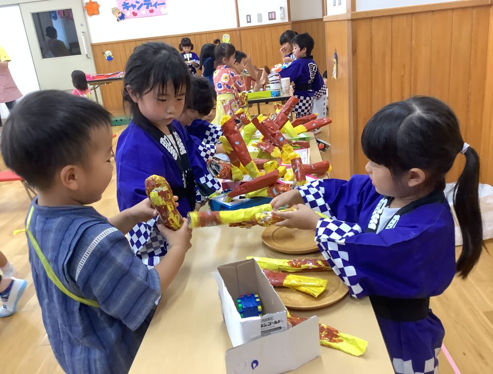 ひまわり組の子どもたちが準備を進めて開いたお店屋さんには、保育園中からたくさんのお客さんがやってきて大賑わい。アイス屋さんやキャンディー屋さん、チョコバナナ屋さんといった食べ物屋さんの他にも、射的やヨーヨー釣り、わなげなどのゲームが楽しめるお店が並び、友だちと一緒に回って楽しむ様子が見られました。乳児クラスの子どもたちも、ひまわり組のお兄さん・お姉さんに遊び方を教えてもらったり、優しく品物を渡してもらいながら楽しんでいました。もらったお土産は子どもたちの宝物になったようです。
