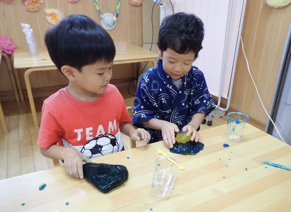 午前中はスライムづくりをしました。魔法の水を混ぜていくと、だんだんと固まっていく様子に大興奮の子どもたち。出来上がったスライムを友だちと交換したり、型抜きを使ってごっこ遊びに展開する姿が楽しそうでした。