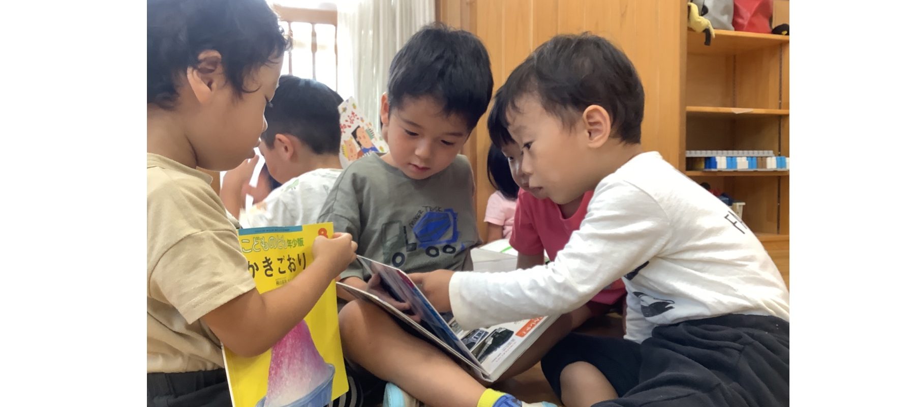 友だちと一緒に図鑑を見ながら「これかっこいいね!」「どれがいい?」と会話を弾ませているたんぽぽ組の子どもたち。最近は「いっせーの!」で自分の好きな物を指差しして遊ぶゲームが流行しています。何人かで同じものになると「いっしょだね」と笑いあっている姿も可愛いです。