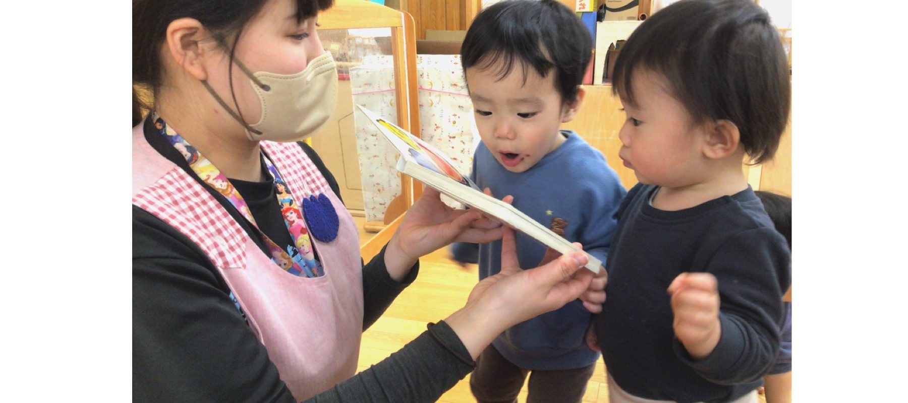 保育者が出し物を始めると自然に子どもたちが集まってきて一緒に手遊びをしたり、言葉の語尾を言ったりと楽しい時間を過ごしている0歳児クラスの子どもたち。絵本に出てくる動物の真似をしたり、食べ物のイラストを見て食べる真似をしている姿がとても可愛らしく読み終わった後も「(もういっ)かい!」と何度も繰り返しお話を楽しんでいます。