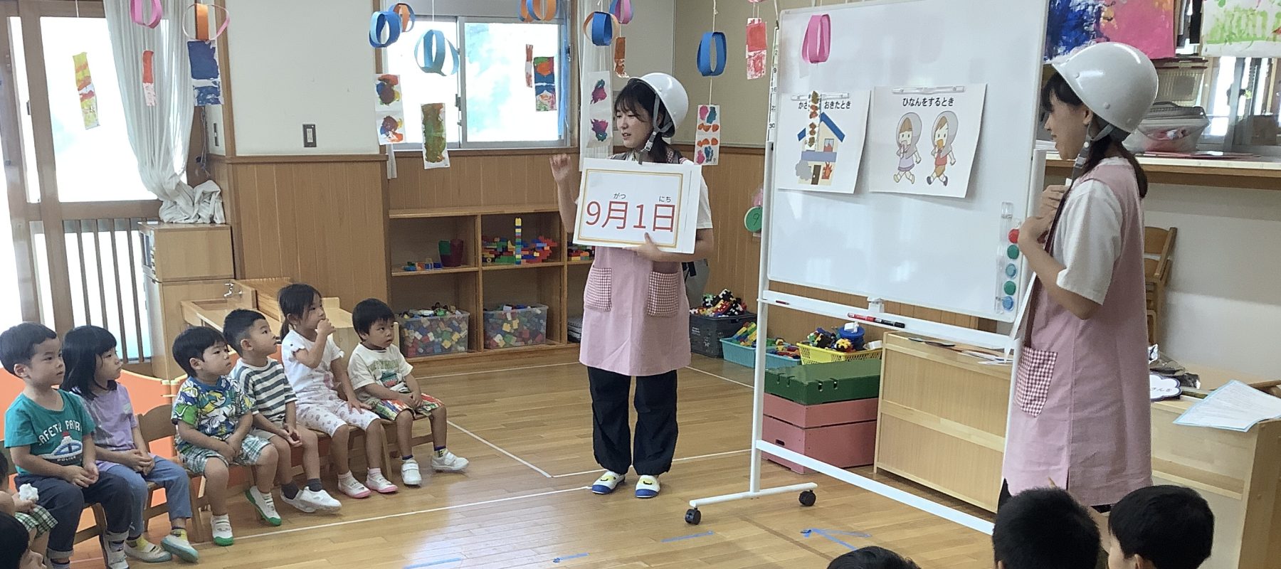 9月1日は「防災の日」ということで、幼児クラスの子どもたちと災害が起きたときの避難の仕方や、防災倉庫の中身についてお話しました。 アルミブランケットを被る体験をしたり、簡易トイレの水が固まる様子を観察したりと、災害について考える機会となりました。
