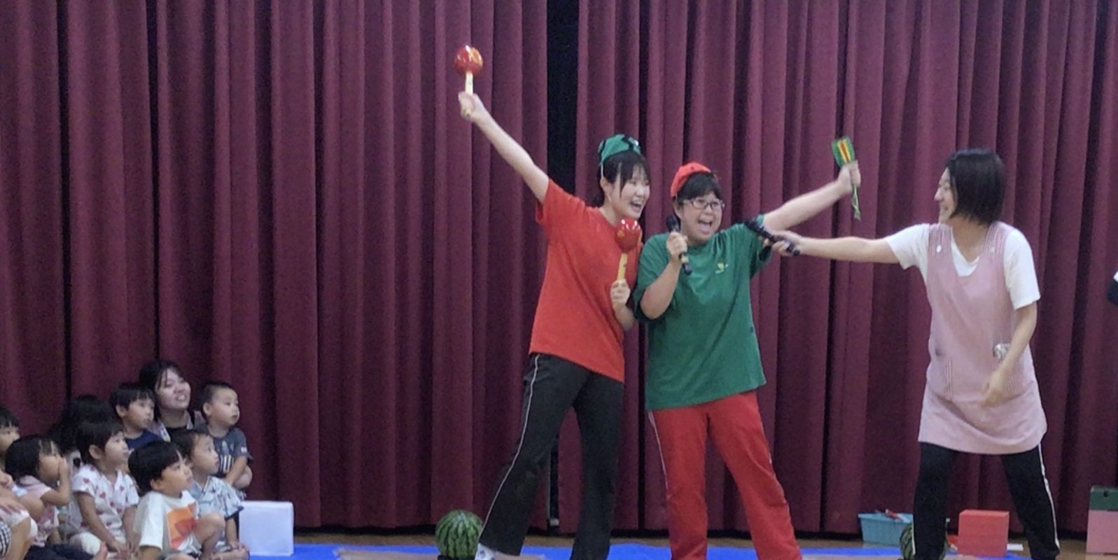 夏の風物詩、スイカ割りがありました。ホールに集まった子どもたちの前にスイカ割り名人の『すいかブラザーズ』が登場し、ダンスを踊ったりと楽しい時間を過ごしました。みんなで力を合わせて割れたスイカはおやつで美味しく頂きました♪