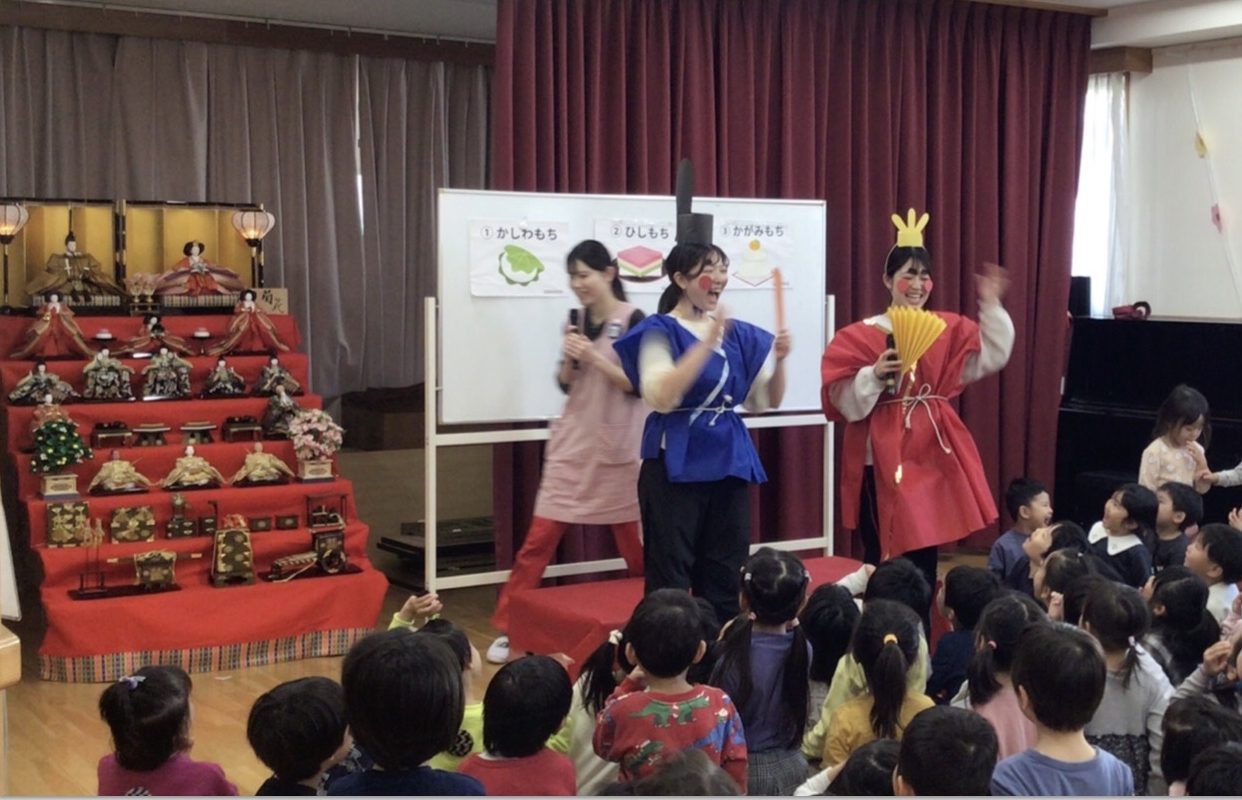 「おひなさまとおだいりさまのさがしもの」の劇ではみんなで大騒ぎしながら着物や扇子を見つけられ大喜びの子どもたち。