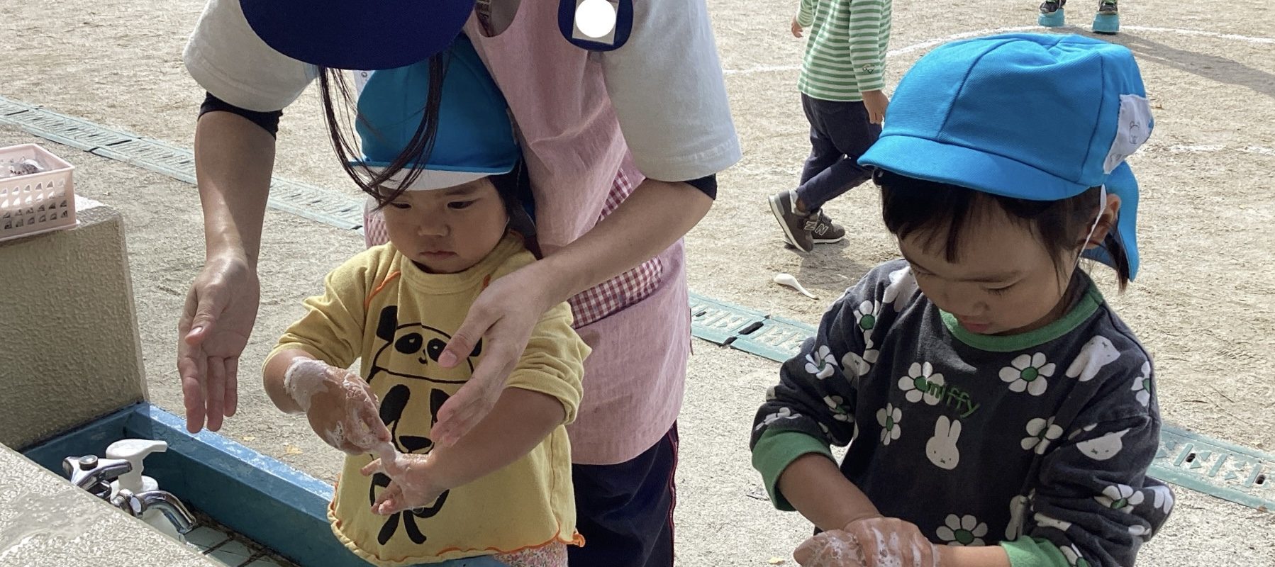 園庭や屋上から帰った後も保育者と一緒に歌い、楽しみながら手洗いを行っています。
