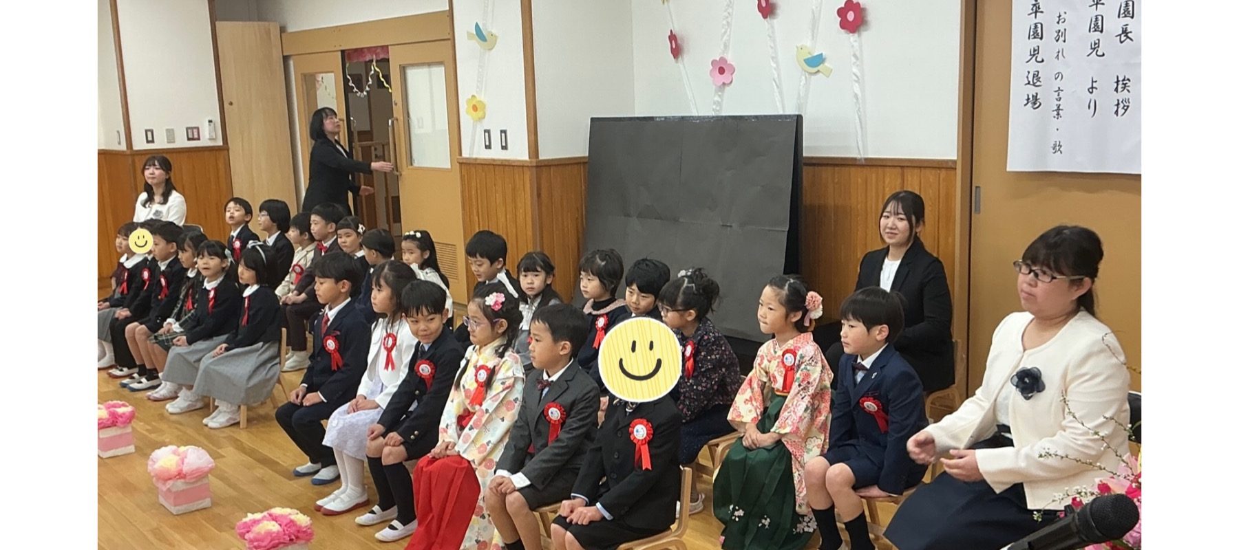 卒園式がありました。緊張した表情で会場に入ってくる姿もありましたが、担任に名前を呼ばれると大きな声で返事をしたり、自分の将来の夢を堂々と話す姿があるなど、とても素敵な卒園式でした。