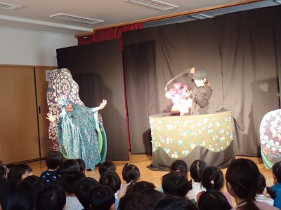 今日は、人形劇団“かわせみ座”の方が来て“カラコロロン森の中で”を観ました。普段と違うホールの雰囲気に、期待を高めていた子どもたち。賑やかな場面では楽しく笑ったり、少しドキドキすような所では、真剣に見つめる姿がありました。生きているように動く人形や、素敵な音楽を聞いて、物語の世界に浸っていました。