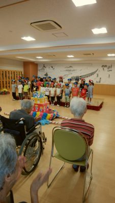 今日、年長組さんが斜め向かいの「故郷の家」に夏祭りで作ったおみこしを担いで、訪問しました。「わっしょい」「わっしょい」と掛け声をかけてホールに入るとおじいちゃん、おばあちゃんも大喜びで拍手や掛け声をかけて迎えてくれました。ダンスや、歌を披露したり、子どもたちと組になり「じゃんけんぱー」「一本橋こちょこちょ」等、触れ合い遊びをすると楽しそうに大声で笑ったりおじいちゃん、おばあちゃん方の笑顔が沢山見られました。