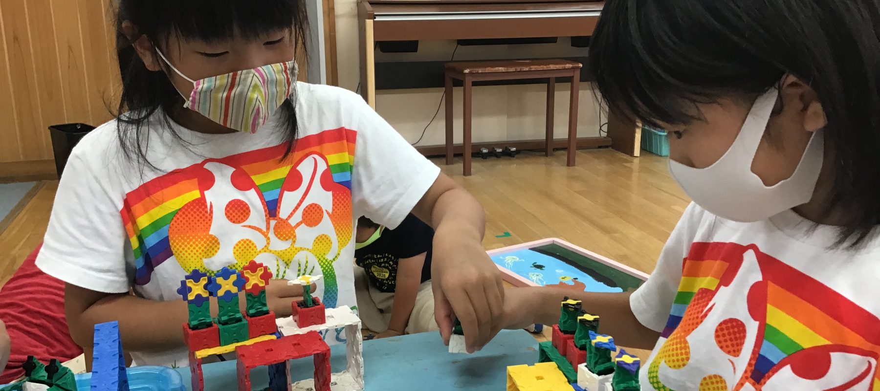 ブロックの小さなピースを組み合わせて、立体の作品がいくつも作り出され、子どもたちの創造力や集中力、手先の器用さにさすが年長さんと驚かされます。