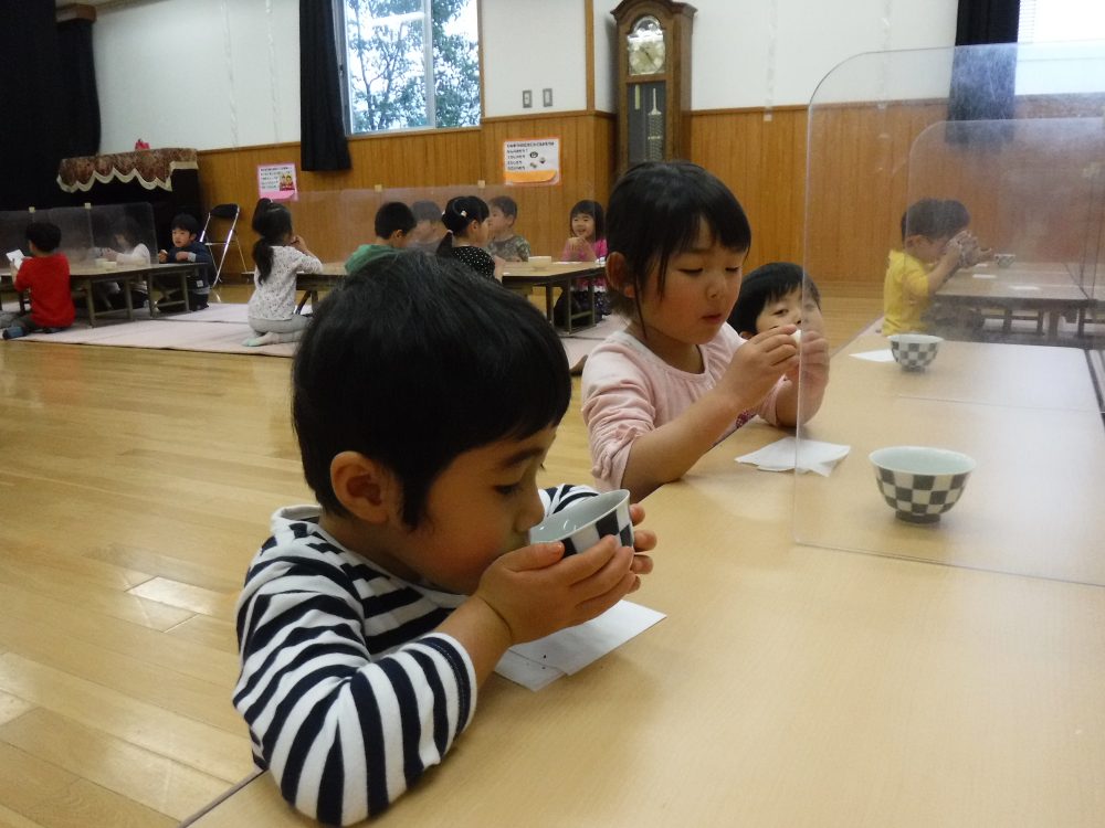 ひな祭りのお茶会を行いました。ひな祭りにちなんだクイズやゲーム、由来についての話を各部屋で聞いた後、2歳から順にホールに集まりお茶会を行いました。ひな人形と桃の花を見ながら、園長先生がたててくれた抹茶と麩菓子を味わいました。室内には琴の曲が流れ、抹茶の味は「ちょっとにがいね」「おいしいね」「おかわりしたいね」と思い思いの感想をお友だちと言いながらお茶会の雰囲気を楽しんでいました。