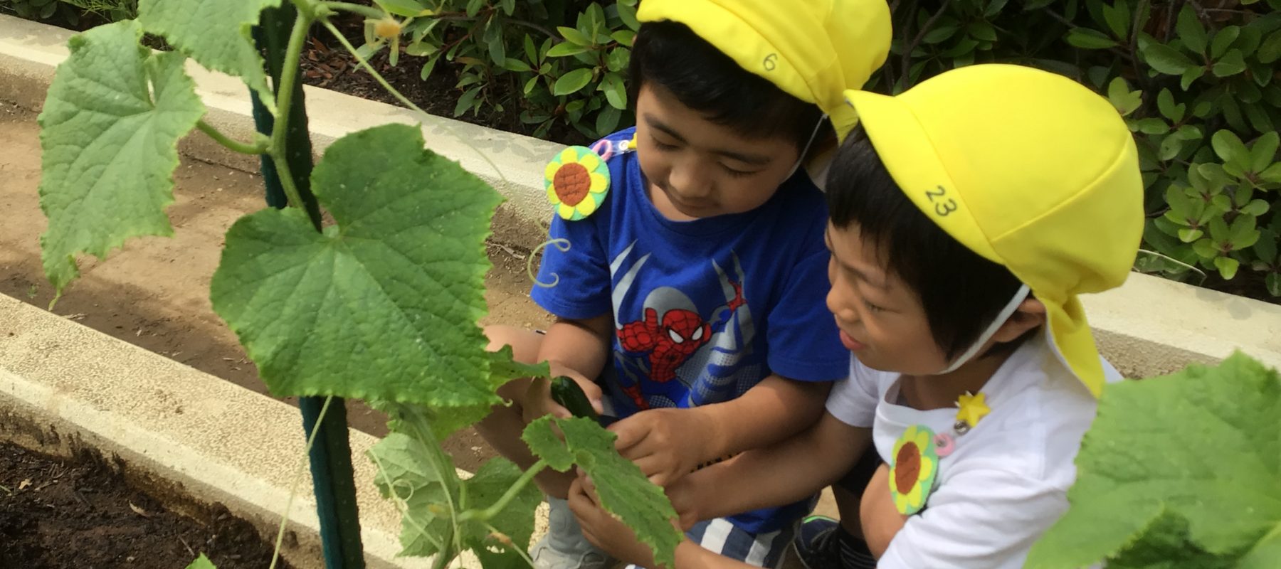 園庭で育てている、きゅうり、ピーマン、ナス。今年は天候が良い日が続いていることもあり、野菜の生長が著しいです。毎日お水を上げて、「大きくなあれ」の魔法をかけている子どもたち。今日は、キュウリを収穫し食べました。自分たちで育てていることもあり、パクパクとよく食べています。これからも収穫した野菜を食べ、食育に繋げていきたいと思います。